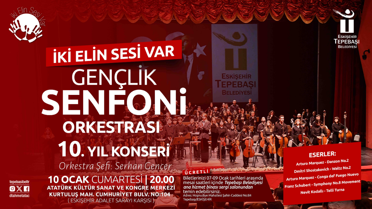 Kurulduğu günden bu yana tam 51 konser veren Tepebaşı Belediyesi İki Elin Sesi Var Gençlik Senfoni Orkestrası, kuruluşunun 10. yılını bir konserle taçlandırmaya hazırlanıyor. Şef Serhan Gencer yönetimindeki orkestra, 10 Ocak Cumartesi günü saat 20.00’de, Atatürk Kültür Sanat ve Kongre Merkezi’nde sahne alacak. Konserde, Danzon No.2, Waltz No.2, Conga def Fuego Nuevo, Symphony No.8 Movement, Telli Turna eserleri çalınacak. Konser biletleri 9 Ocak günü mesai bitimine kadar Tepebaşı belediyesi ana hizmet binası sergi salonundan temin edilebiliyor.