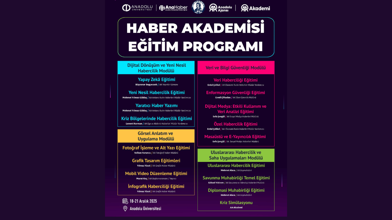 “Haber Akademisi Eğitim Programı”nın açılışı Anadolu Üniversitesi İletişim Bilimleri Fakültesi Şener Şen Salonu’nda gerçekleştirilecek. Program, İBF Frig Salonu’nda devam edecek. Eğitim programı kapsamında Anadolu Ajansı’nın alanında uzman isimleri tarafından, güncel medya pratiklerinin yanı sıra habercilikte öne çıkan yeni stratejik alanları kapsayan kapsamlı eğitimler verilecek. Dört gün sürecek eğitim programında; yapay zekâ, veri haberciliği, kriz bölgelerinde gazetecilik, dijital ve sosyal medya haberciliği, fotoğraf ve grafik tasarım, mobil video düzenleme ile savunma ve diplomasi muhabirliği gibi başlıklar ele alınacak.