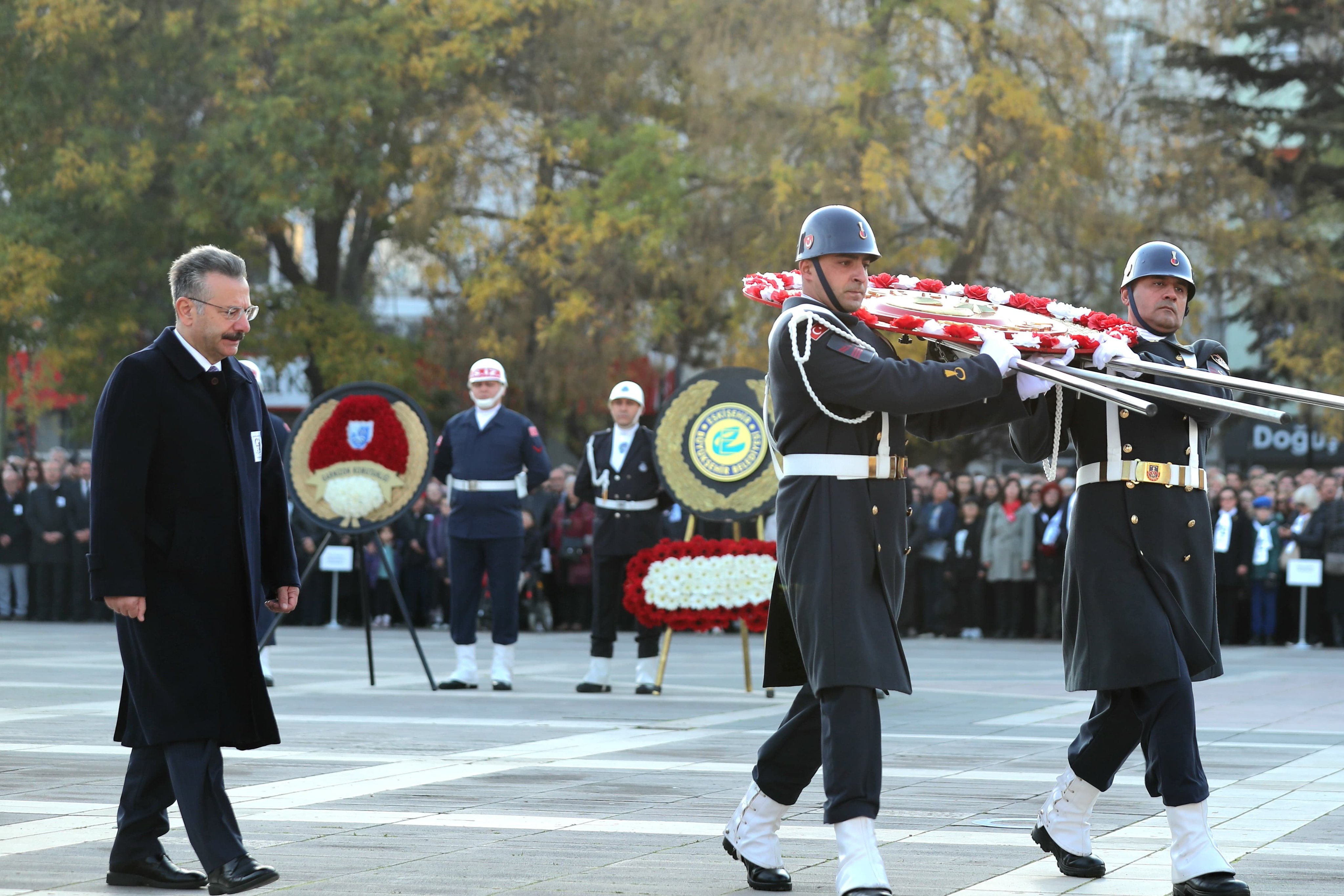 Tören, Eskişehir Valisi Hüseyin Aksoy, Muharip Hava Kuvveti ve Garnizon Komutanı Hava Orgeneral Rafet Dalkıran ve Büyükşehir Belediye Başkanı Ayşe Ünlüce’nin Vilayet Meydanı’ndaki Atatürk Anıtı’na çelenk sunumuyla başladı.