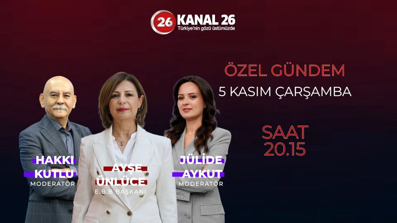Kanal 26 ekranlarında yayınlanan “Özel Gündem” programı bu hafta önemli bir ismi ağırlıyor. Hakkı Kutlu ve Jülide Aykut moderatörlüğünde gerçekleştirilecek programın bu haftaki konuğu, Eskişehir Büyükşehir Belediye Başkanı Ayşe Ünlüce olacak.