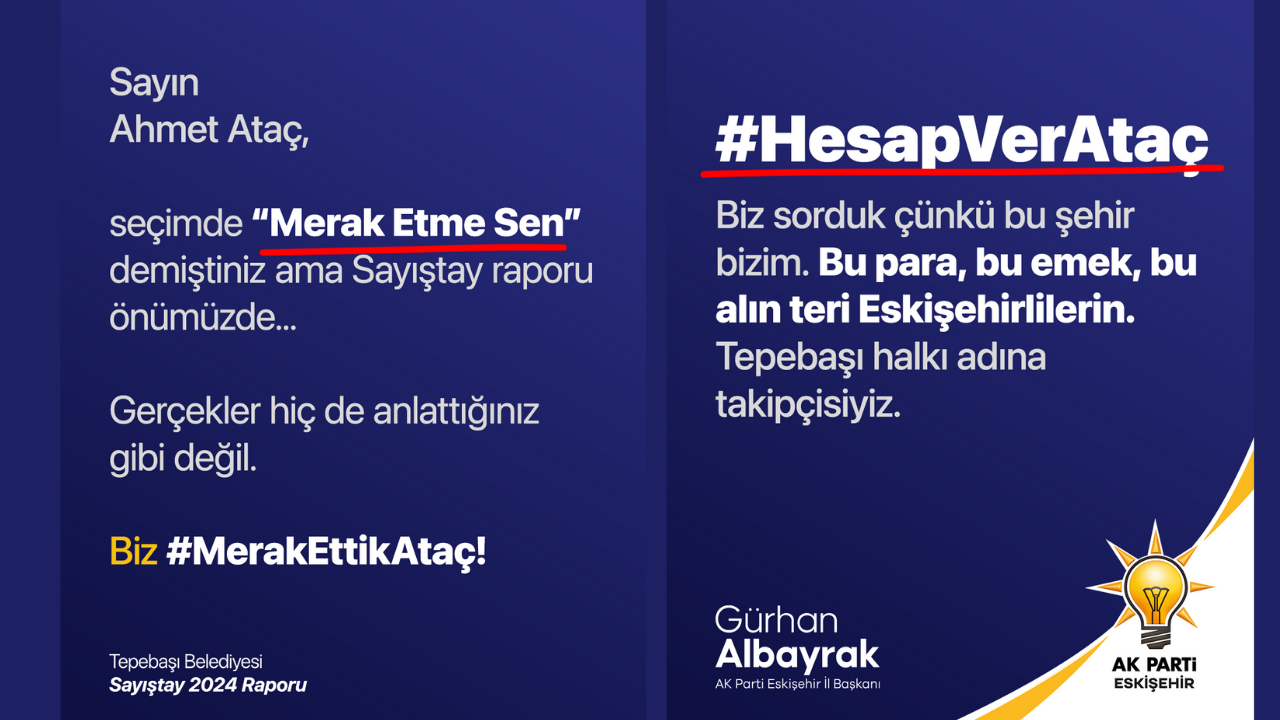 AK Parti Eskişehir İl Başkanı Gürhan Albayrak, Sayıştay’ın Tepebaşı Belediyesi’ni denetlediği raporda ortaya çıkan “vahim” bulgulara ilişkin kapsamlı bir basın açıklaması yaptı. Başkan Albayrak, Tepebaşı Belediye Başkanı Ahmet Ataç’a yönelik sorularını dile getirerek, seçim döneminde kullanılan “Merak Etme Sen” sloganına atıfta bulundu ve “Biz merak ettik” ifadelerini öne çıkardı.