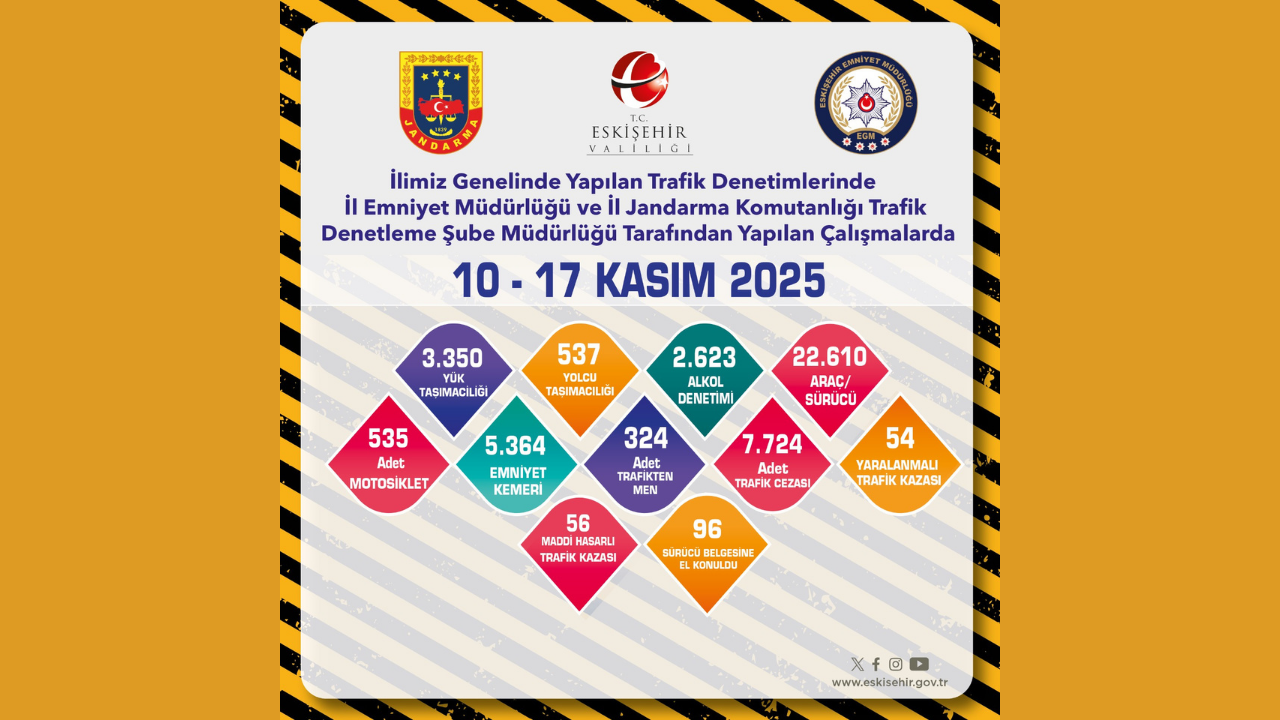 İl Emniyet Müdürlüğü ve İl Jandarma Komutanlığına bağlı trafik ekipleri, kent genelinde sürücüleri ve araçları denetlemeye devam ediyor. 10-17 Kasım 2025 tarihleri arasında yapılan denetimlerde dikkat çeken rakamlar ortaya çıktı.