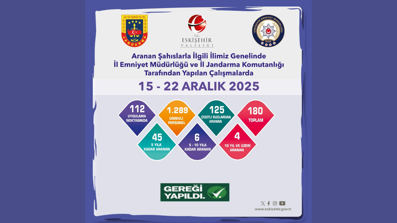 Eskişehir İl Emniyet Müdürlüğü ve İl Jandarma Komutanlığı yetkilileri, vatandaşların huzur ve güvenliğini sağlamak amacıyla aranan şahıslara yönelik denetim ve uygulamaların kararlılıkla devam edeceğini bildirdi.