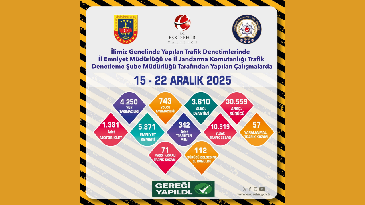 15.12.2025 – 22.12.2025 tarihleri arasında Eskişehir İl Emniyet Müdürlüğü ve İl Jandarma Komutanlığı’na bağlı ekipler tarafından il genelinde kapsamlı trafik denetimleri gerçekleştirildi.