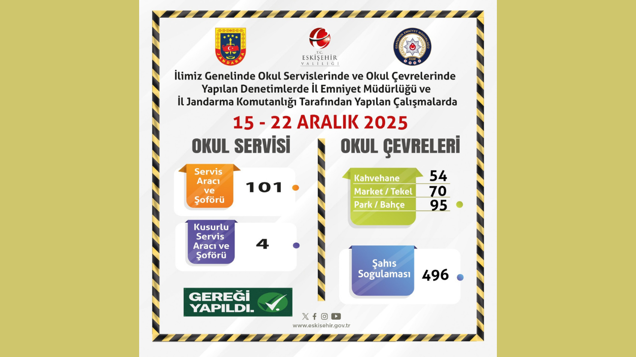 15–22 Aralık 2025 tarihleri arasında yapılan uygulamalarda, 101 okul servisi aracı ve sürücüsü denetlenirken, kusurlu bulunan 4 servis aracı ve şoförü hakkında gerekli işlemler yapıldı.