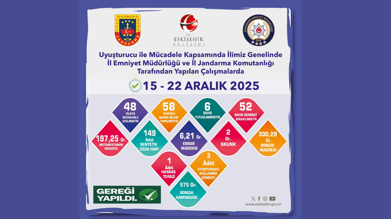 15.12.2025–22.12.2025 tarihleri arasında Eskişehir İl Emniyet Müdürlüğü ve İl Jandarma Komutanlığı’na bağlı ekipler tarafından kent genelinde yürütülen denetim ve operasyonlarda uyuşturucuyla mücadele kapsamında önemli sonuçlar elde edildi.