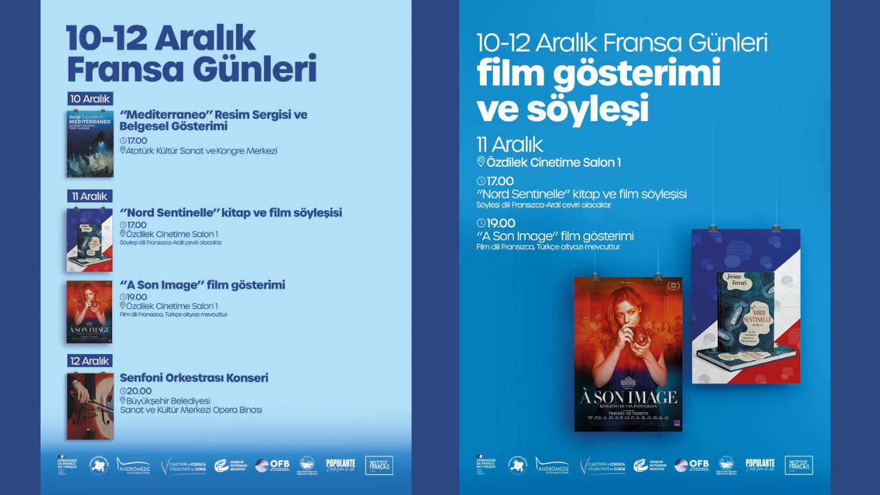 Fransa Günleri, 10 Aralık Çarşamba saat 17.00’de Atatürk Kültür Sanat ve Kongre Merkezi’nde Akdeniz'in büyüleyici atmosferini tuvallere ve kamera lenslerine taşıyan “Mediterraneo” resim sergisi ve belgesel gösterimi ile kapılarını aralayacak. Sanatseverler, açılış gününde Fransa ve Akdeniz kültürünün zarif yorumlarıyla buluşacak.
